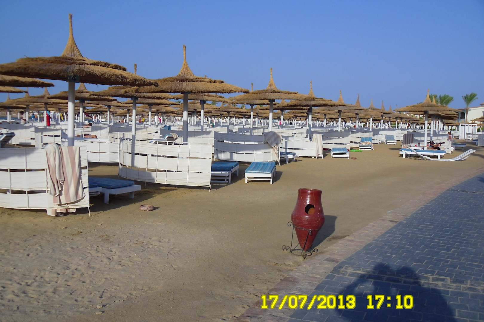 Der Strand ist sehr sauber, es ist ein feiner Kiesstrand. Wir haben uns Badeschuhe zum schwimmen für 5.-€ gekauft und konnten damit auch schwimmen und konnten im heißen Sand gut gehen.