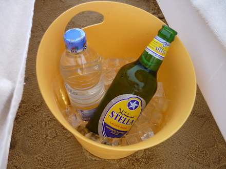 Eimer am Strand mit Eis das Trinken bleibt kalt