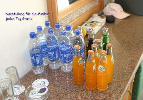 Jeden Tag wurde die Minibar kostenlos aufgefüllt. Wir hatten den Zimmerservice gebeten die Getränke mal auf die Platte zu stellen um ein Foto zu machen.