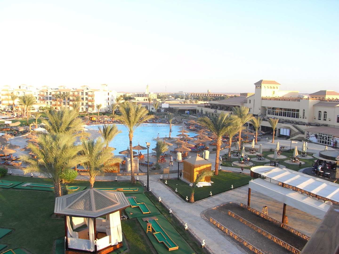 Blick aus unserem Zimmer auf einen der drei Pools, auf die Minigolfanlage (Nutzung von morgens bis Abends kostenlos), Rechts Lobby-Gebäude mit 2 Restaurants.