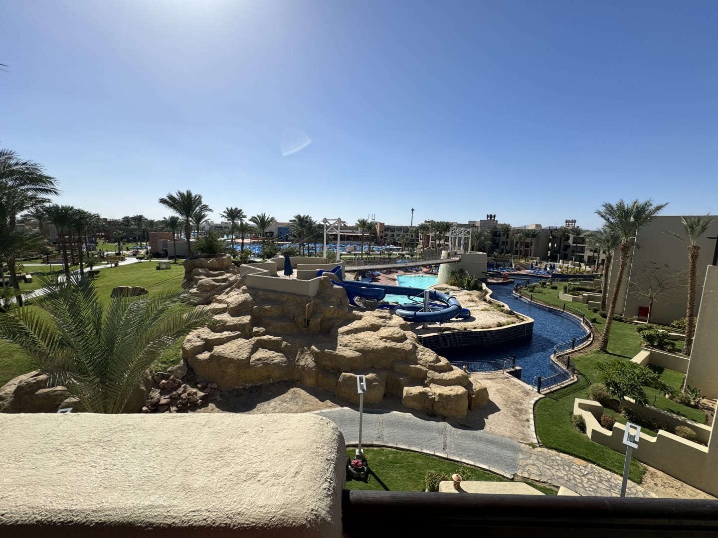 Hier sieht man die Ansicht aus dem Balkon auf den Poolbereich, immer gutes Wetter und ein guter Ausblick, zudem immer eine Möglichkeit seine nassen Badesachen zu trocknen und Top Zimmerservice dem ich eine 10/10 geben würde.