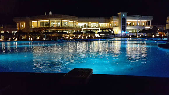 Hauptgebäude nachts vom Pool aus