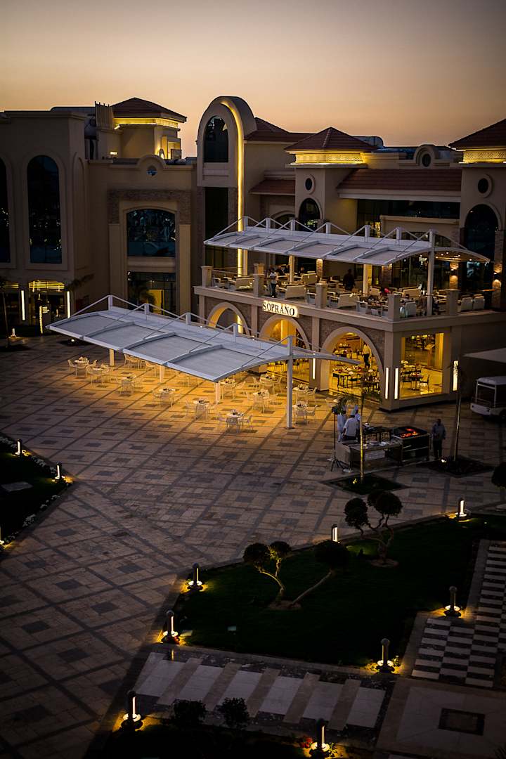 eines der vier Themenrestaurants vom Zimmer aus fotografiert