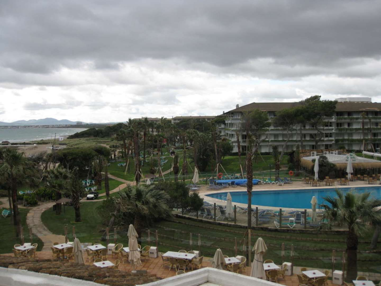 Blick vom Zimmer auf Garten und Pool