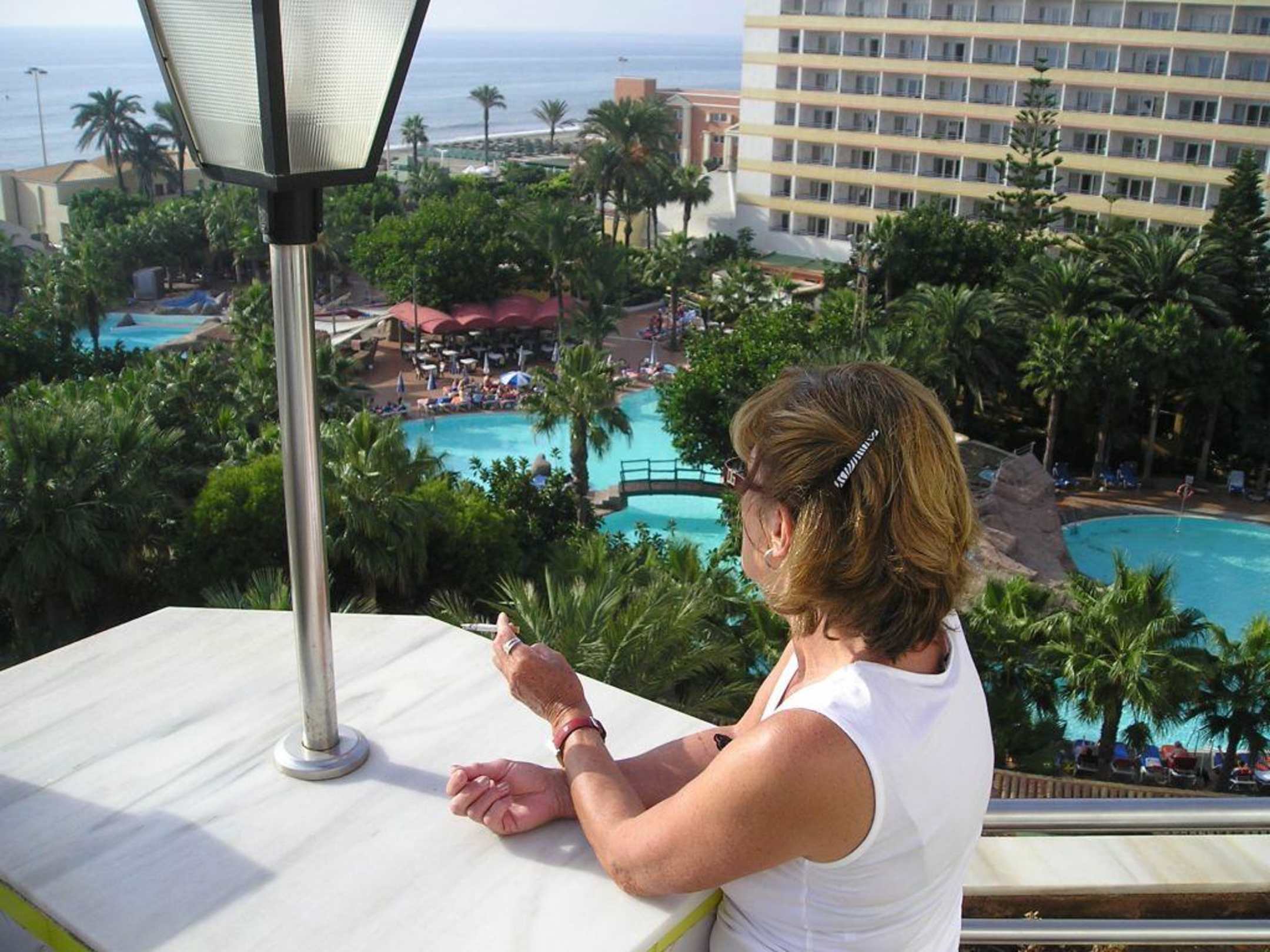 Blick von unserer Terrasse auf Pool, Meer und Playasol
