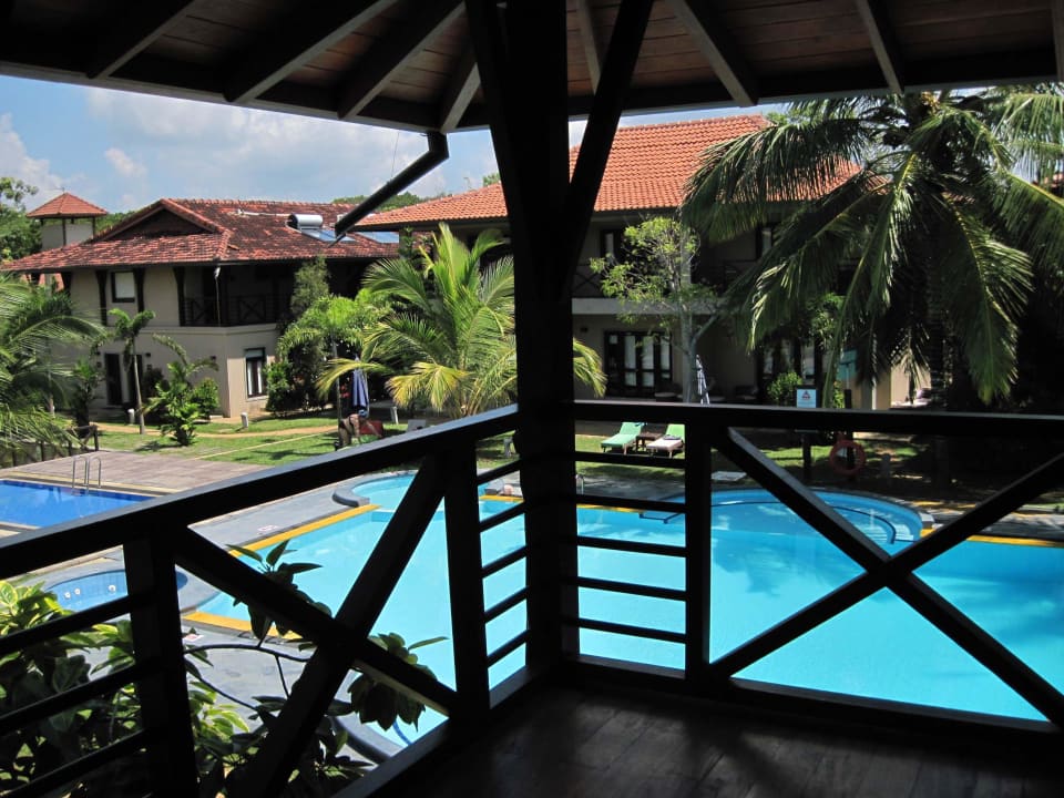 Blick aus dem Obergeschoss auf den Pool
