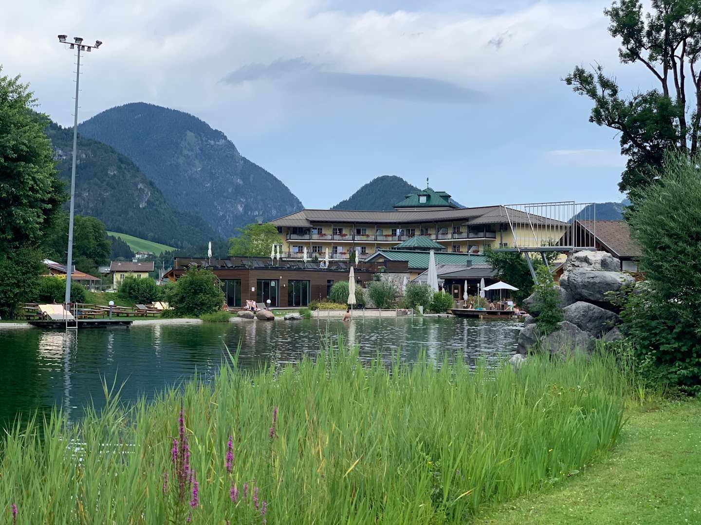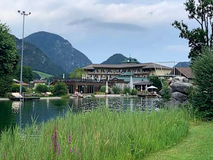 Badesee mit Hotel im Hintergrund