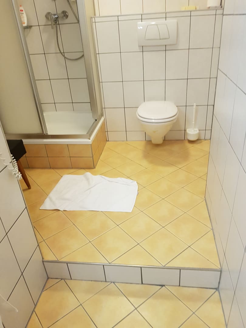 Gefährliche Stufe und enge Duschkabine