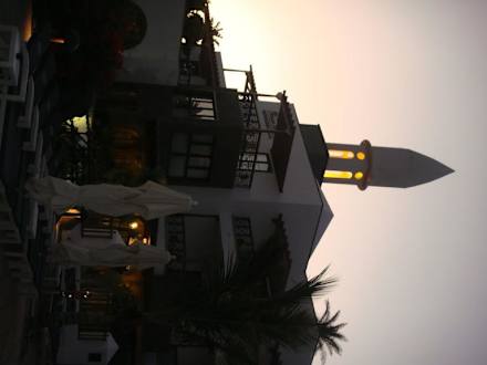 Teil des Hotels bei Dämmerung