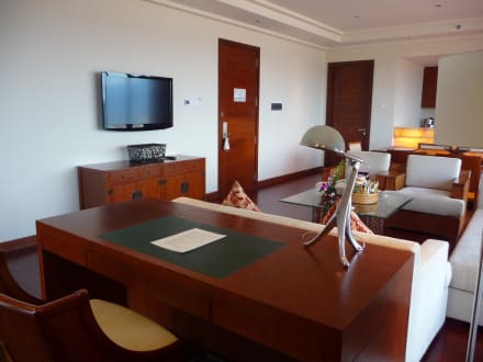Schreibtisch und Sitzgruppe mit Blick auf TV