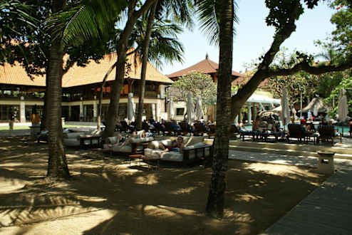 Blick vom Strand auf Pool und Restaurant