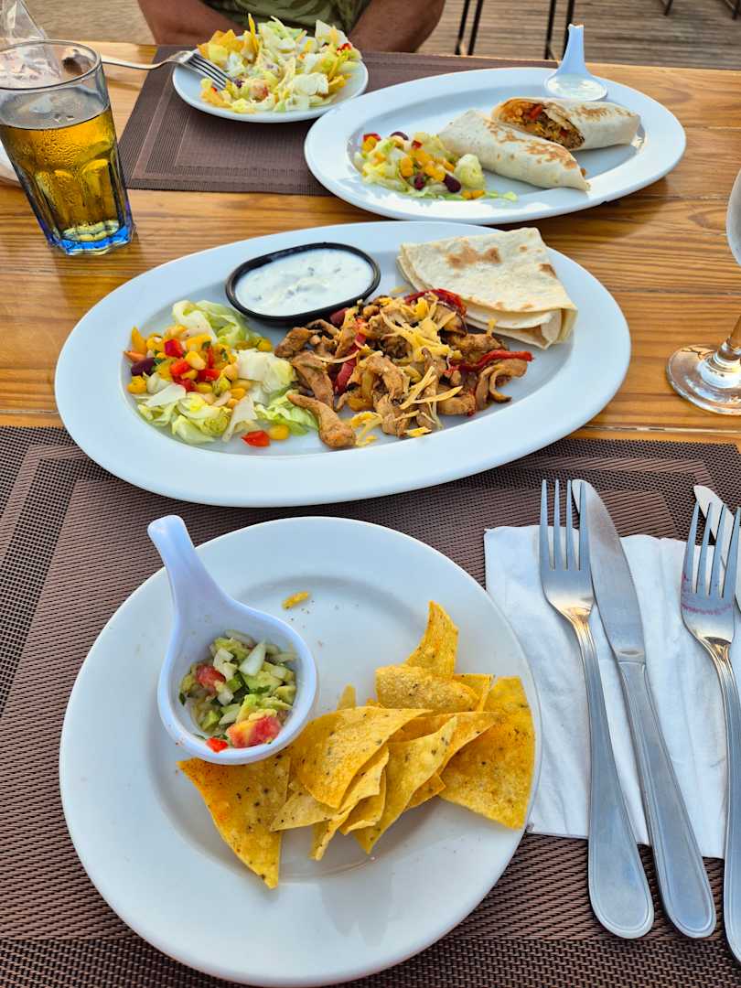 Mexikanisches Abendessen im Restaurant direkt am Strand bei Sonnenuntergang