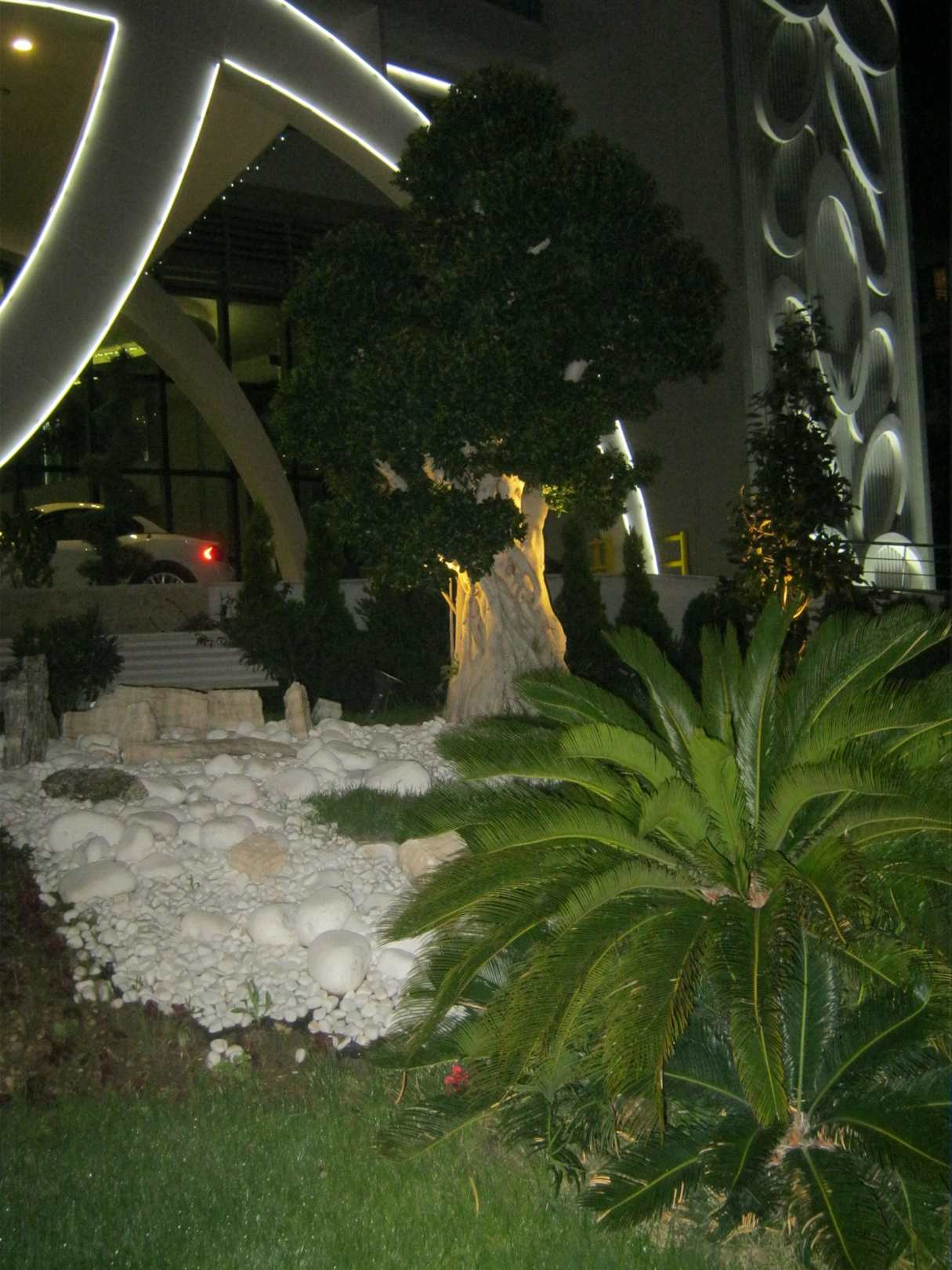 Blick zum Hoteleingang am Abend