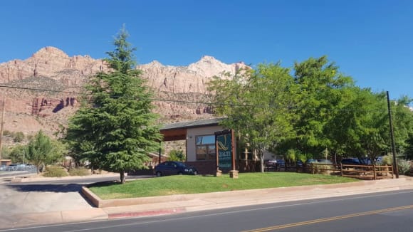 Blick von Bushaltestelle auf Hoteleingang