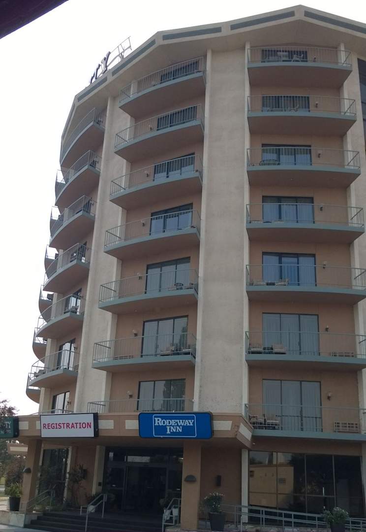 AußenansichtLinks vom Schild "Registration" das Hotelschild für das Quality Inn, rechts davon das Hotelschild für das Rodeway Inn