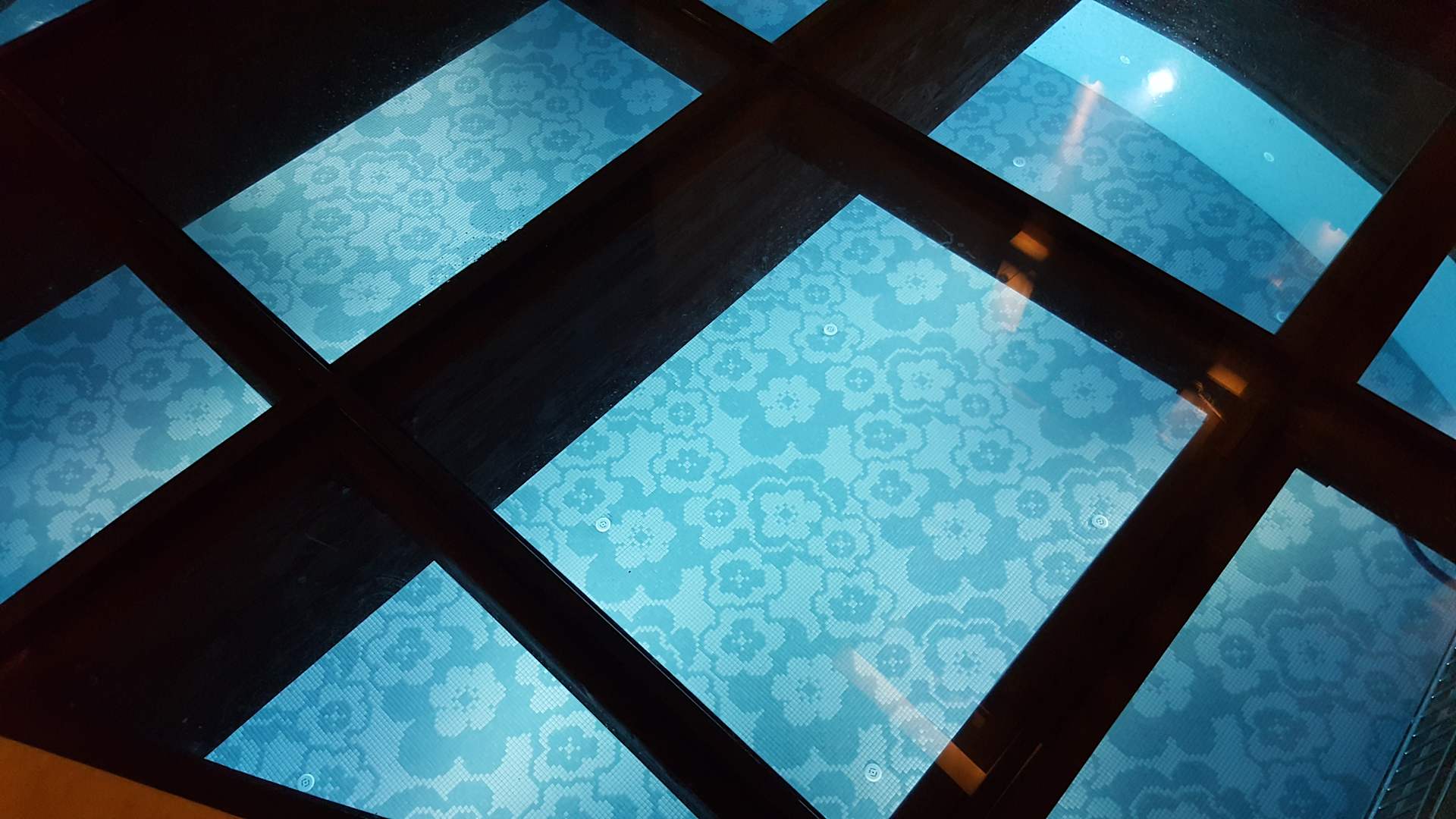 Indoor Pool mit Blick von der Terrasse durch eine Glasplatte