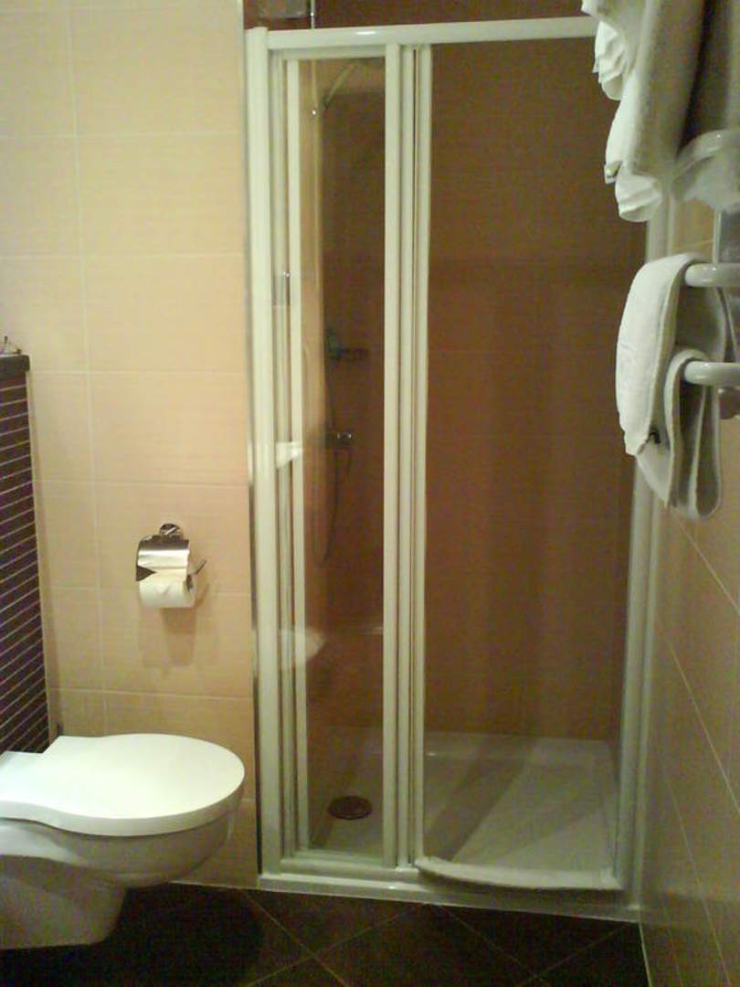 Dusche im Badezimmer. Rechts Handtuchhalter (mit Möglichkeit zum vorwärmen). Links Toilette.