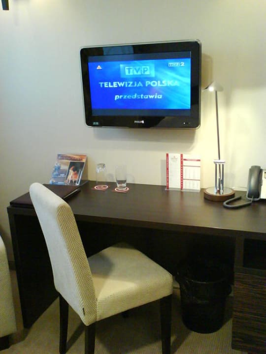 Schreibtisch und TVDer Schreibtisch mit Polsterstuhl. Darüber das TV-Gerät (Flatscreen). Gutes Bild. Deutsche Programme verfügbar.