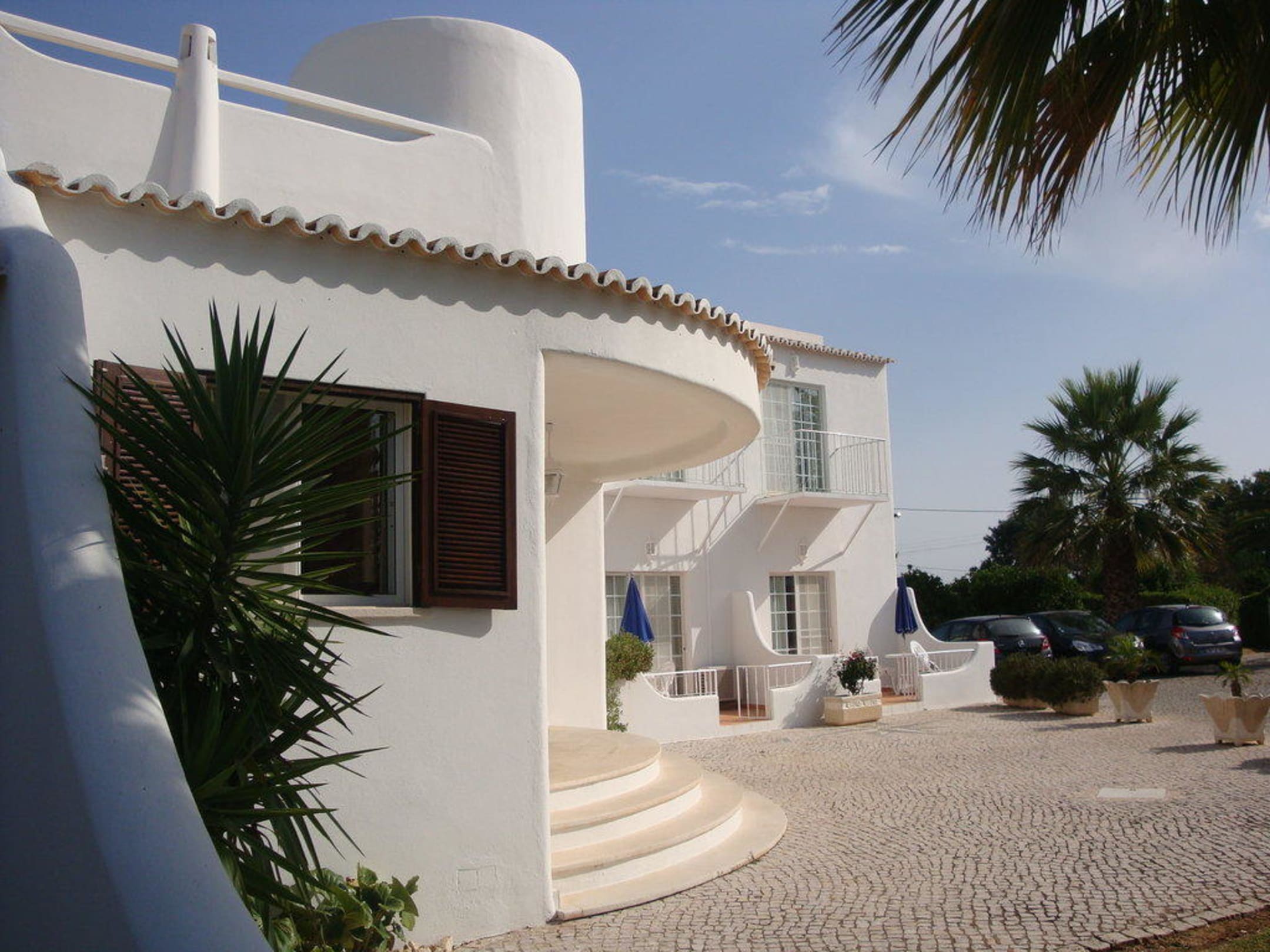Blick von der sehr schönen Terrasse Richtung Haupthaus mit Rezeption und Parkplätze.