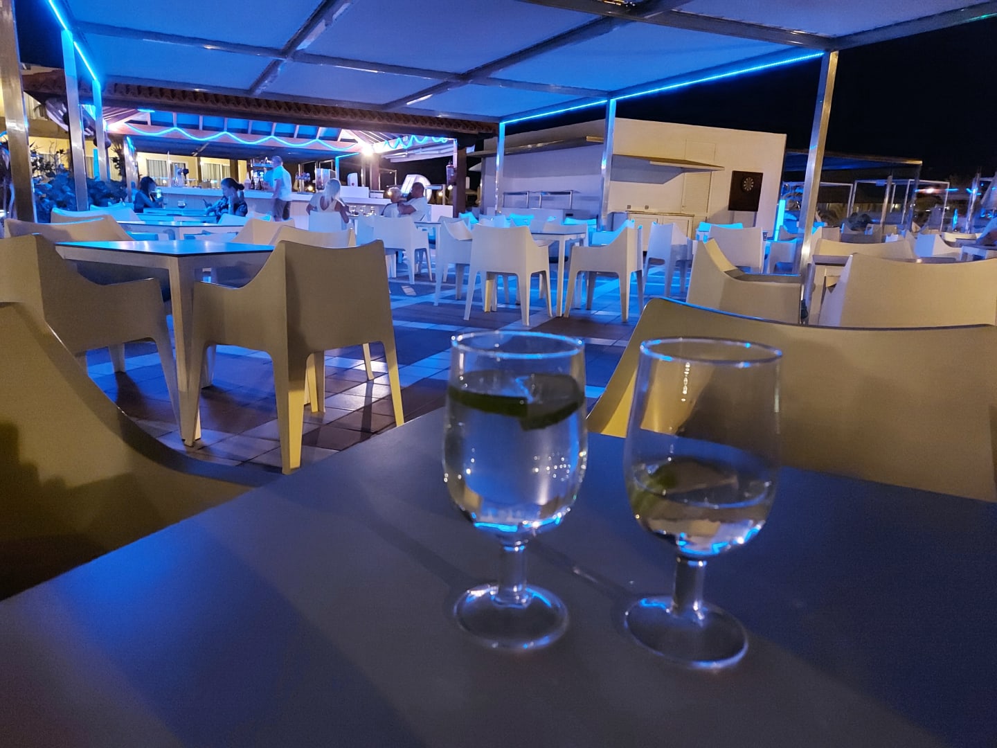 Poolbar am Abend - mit GinTonic und Wasser
