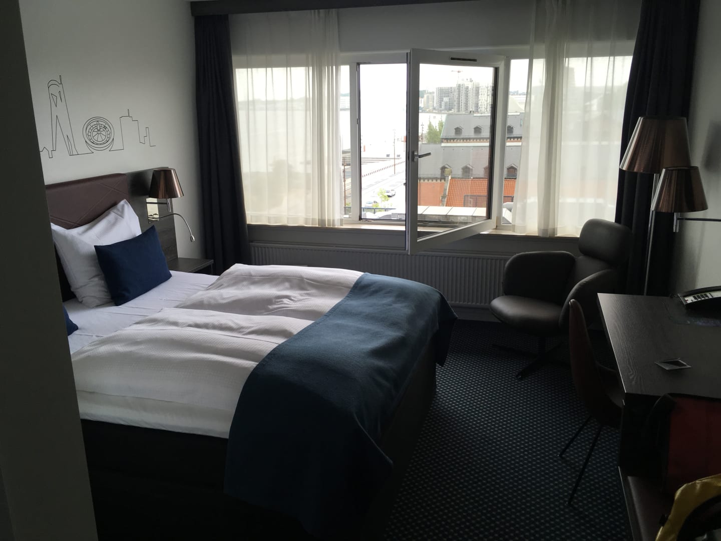 ZimmerKlein aber fein. Schöne Ledersessel und Hocker, gutes Bett, funktionaler Schreibtisch mit USB.
