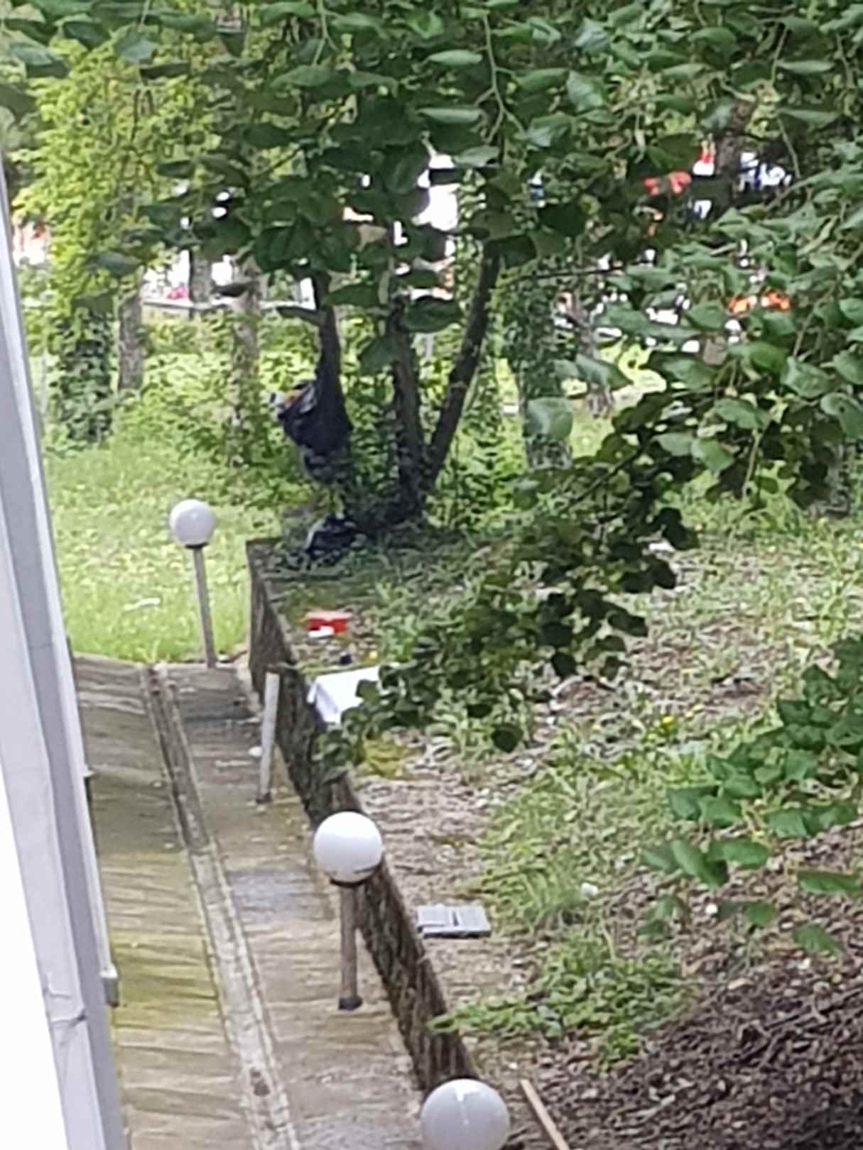 Müllbeutel der Angestellten am Baum, Ausblick Zimmer 212 E