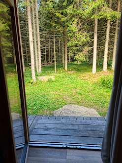 Der wunderschöne Ausblick von der Terrasse in den Wald
