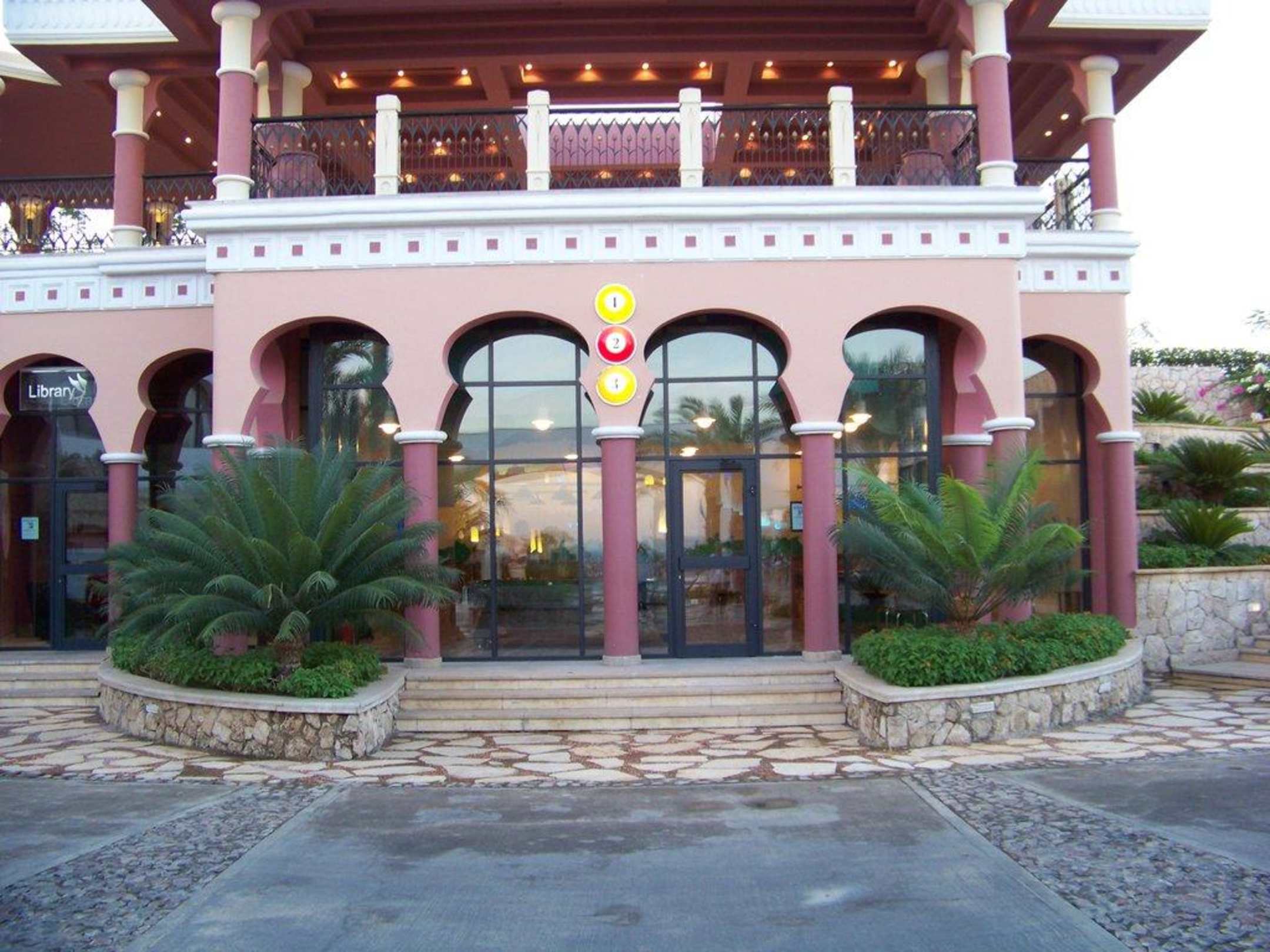 Billard- und BüchereigebäudeMan sieht direkt auf das Billardgebäude. Links daneben sieht man gerade noch den Eingang zur Bücherei.