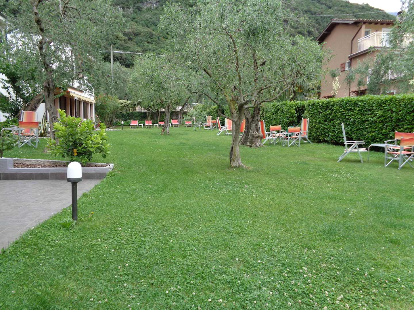 Garten mit Tischen und Liegen