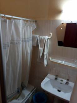 Dusche und Waschtisch im Zimmer.