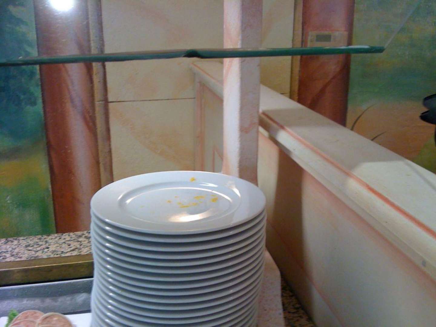 Lecker Frühstücken. Hmmmm...Keine Brötchen. Dem Personal fällt es nicht weiter auf. Dafür war der Teller am Wurstbuffet schon lecker belegt...