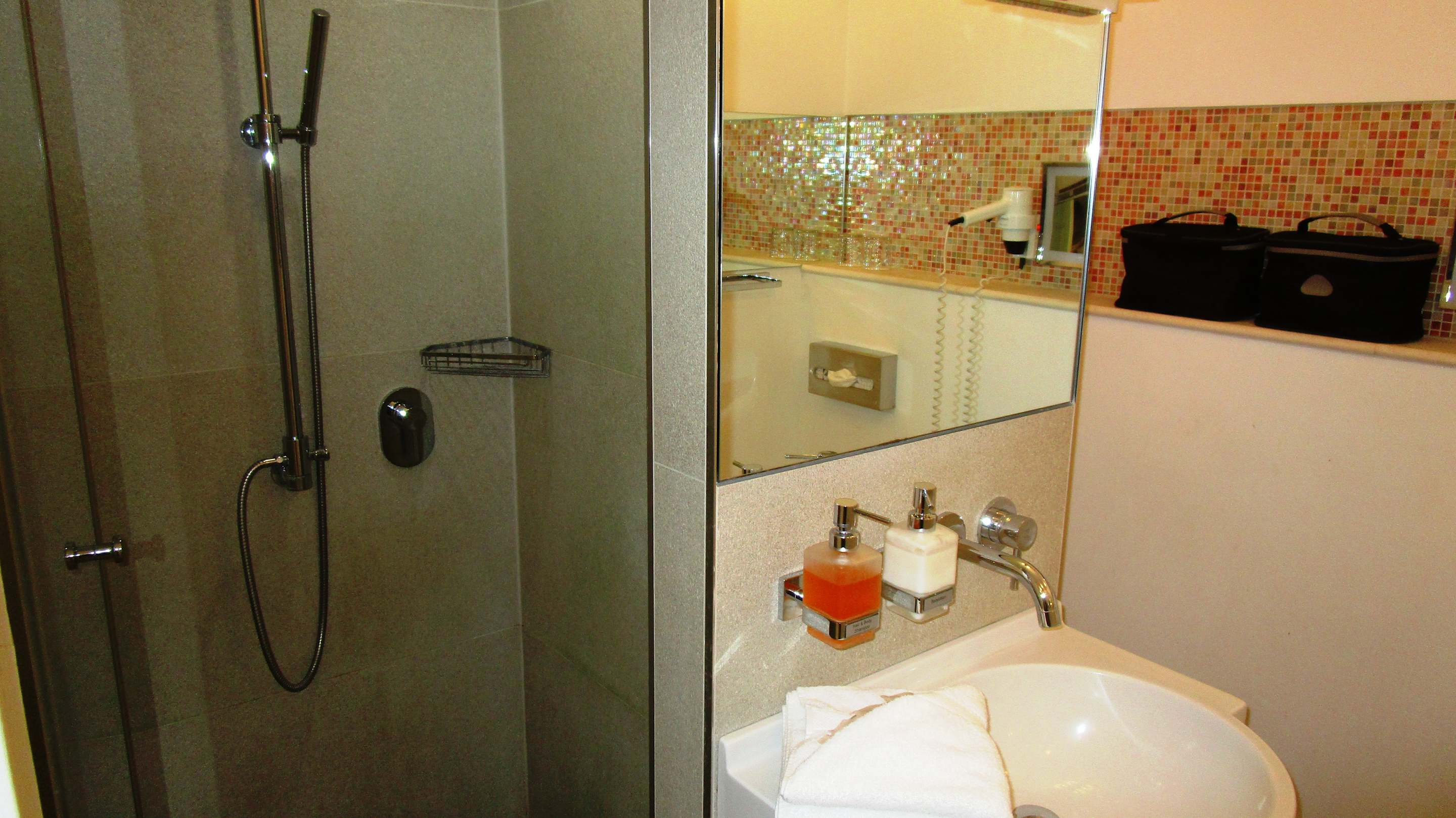 Enge Dusche -ebenerdig- Badezimmer ansonsten sauber und gepflegt.