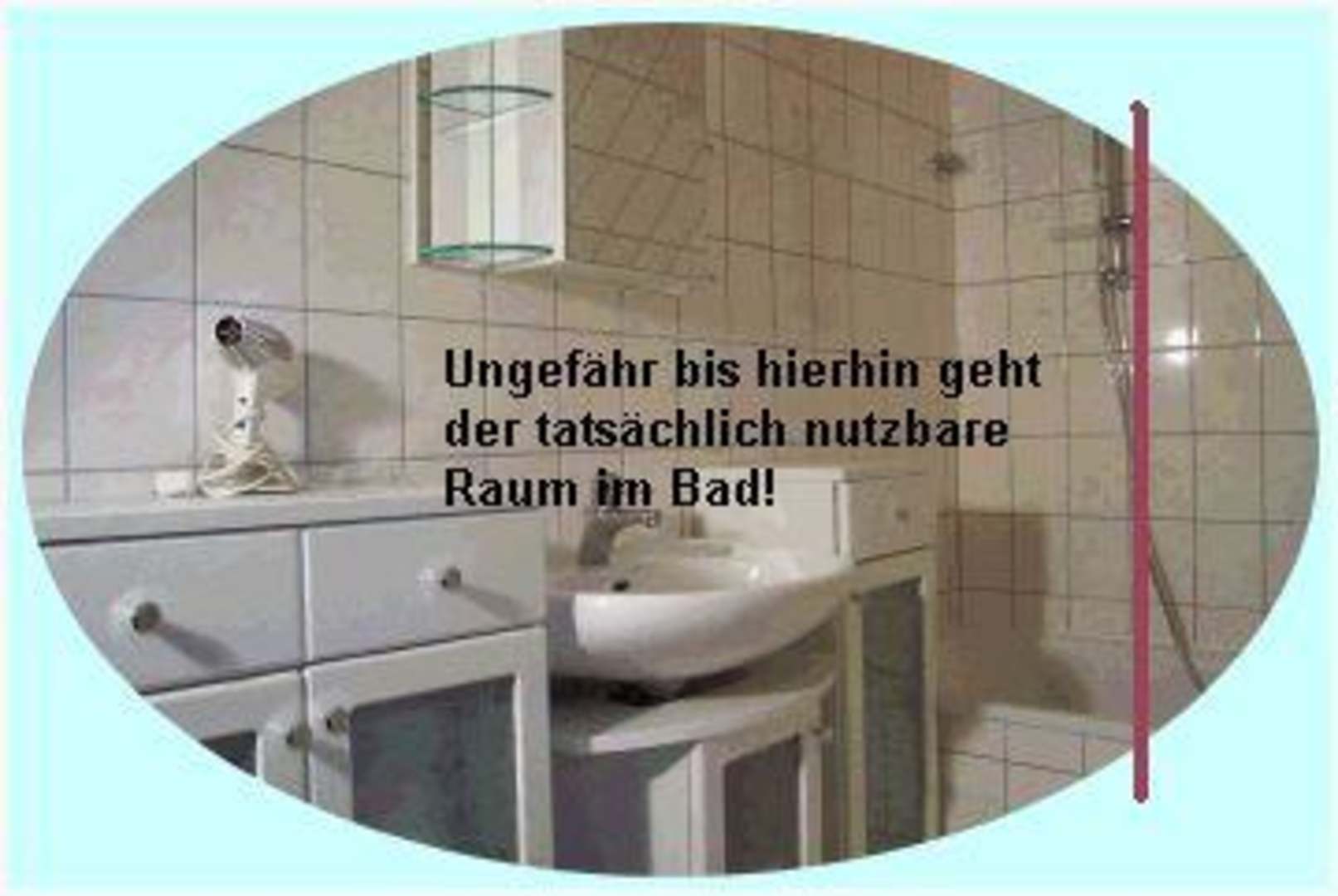 BadansichtBild des Bades in dem die eigentliche Größe bzw. der Begin der Dachschräge etwas deutlich gemacht wird.