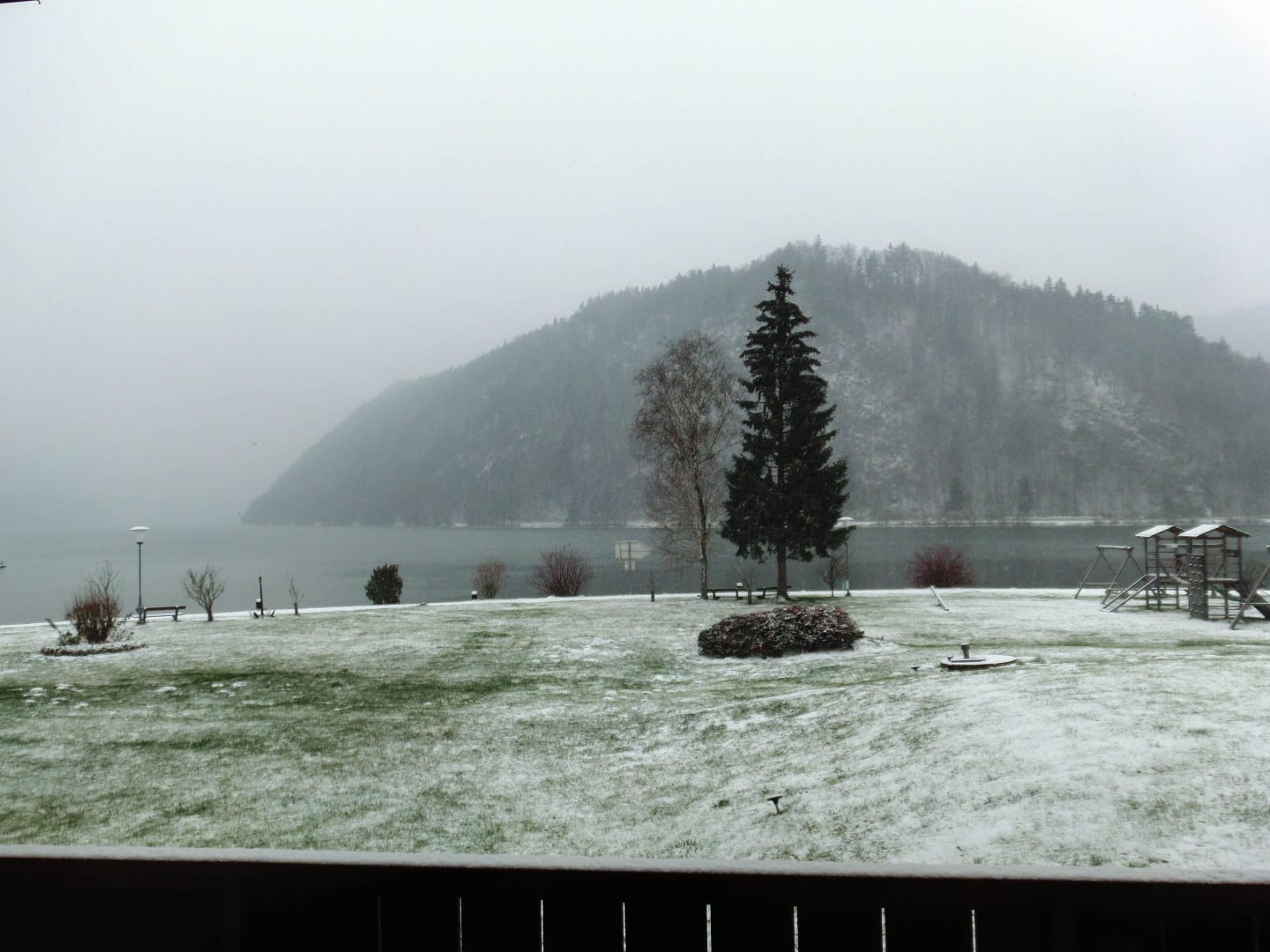 Blick im Morgengrauen bei Schneefall