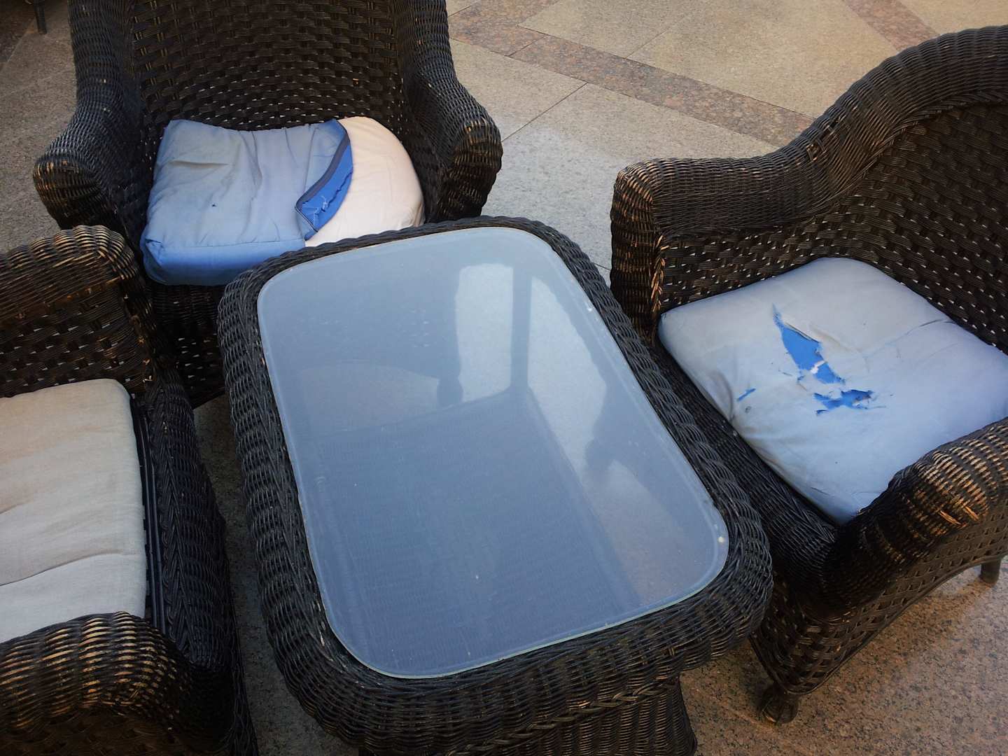Terrasse hinter Lobby m. zerrissenen Polstern
