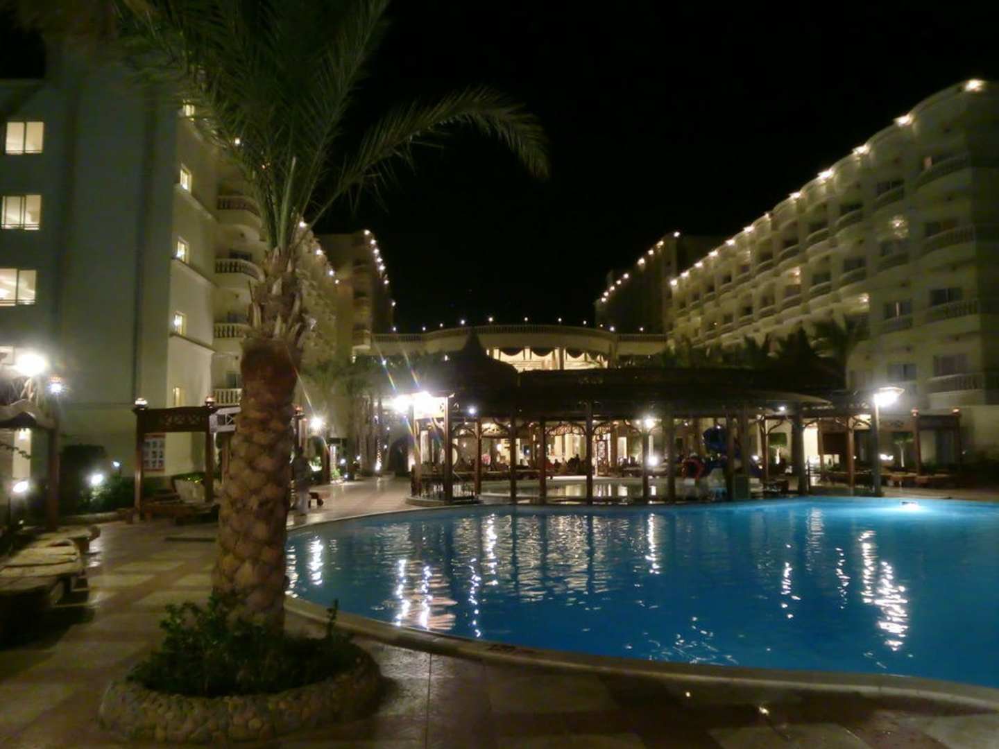 Pool am Abend mit Blick auf Hotel