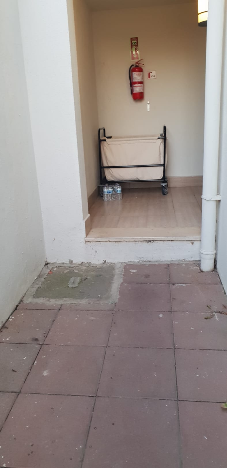 unsere meinung nach gehört dort eine platte und die wasserflaschen sollten vielleicht nicht auf dem Gang stehen. Gehört nicht zur ein Premium Hotel dazu.
