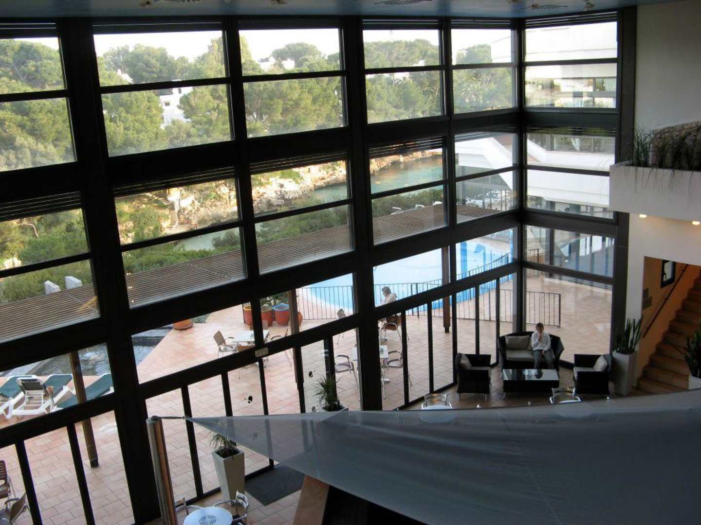 unterwegs im ClubBlick in die Wellfit-Oase (in der Bildmitte ist der Außenpool zu erkennen, dahinter die kleine Bucht "Cala Serena" zu erahnen)