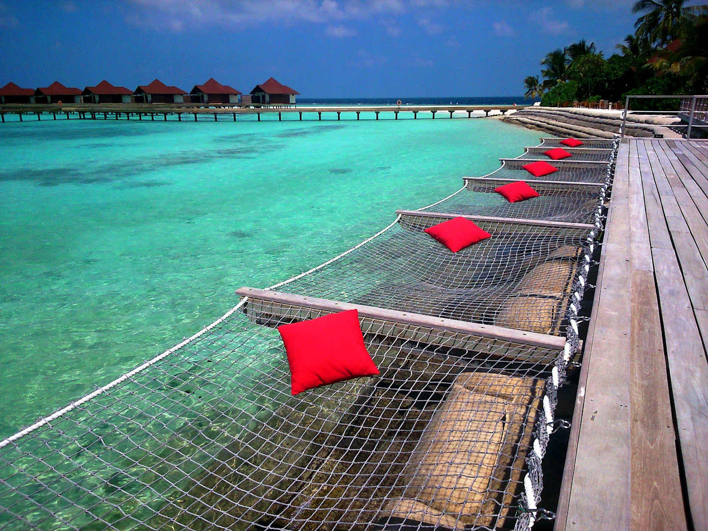 Blick von der Sonnenterrasse beim PoolVor der Terasse spannen sich mehrere Netze als Sonnenliegen über das Meer in Richtung Wasserbungalows.