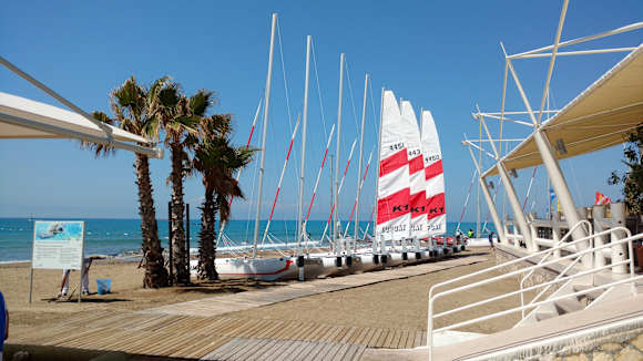 Blick auf Strandrestaurant und Katamarane