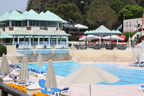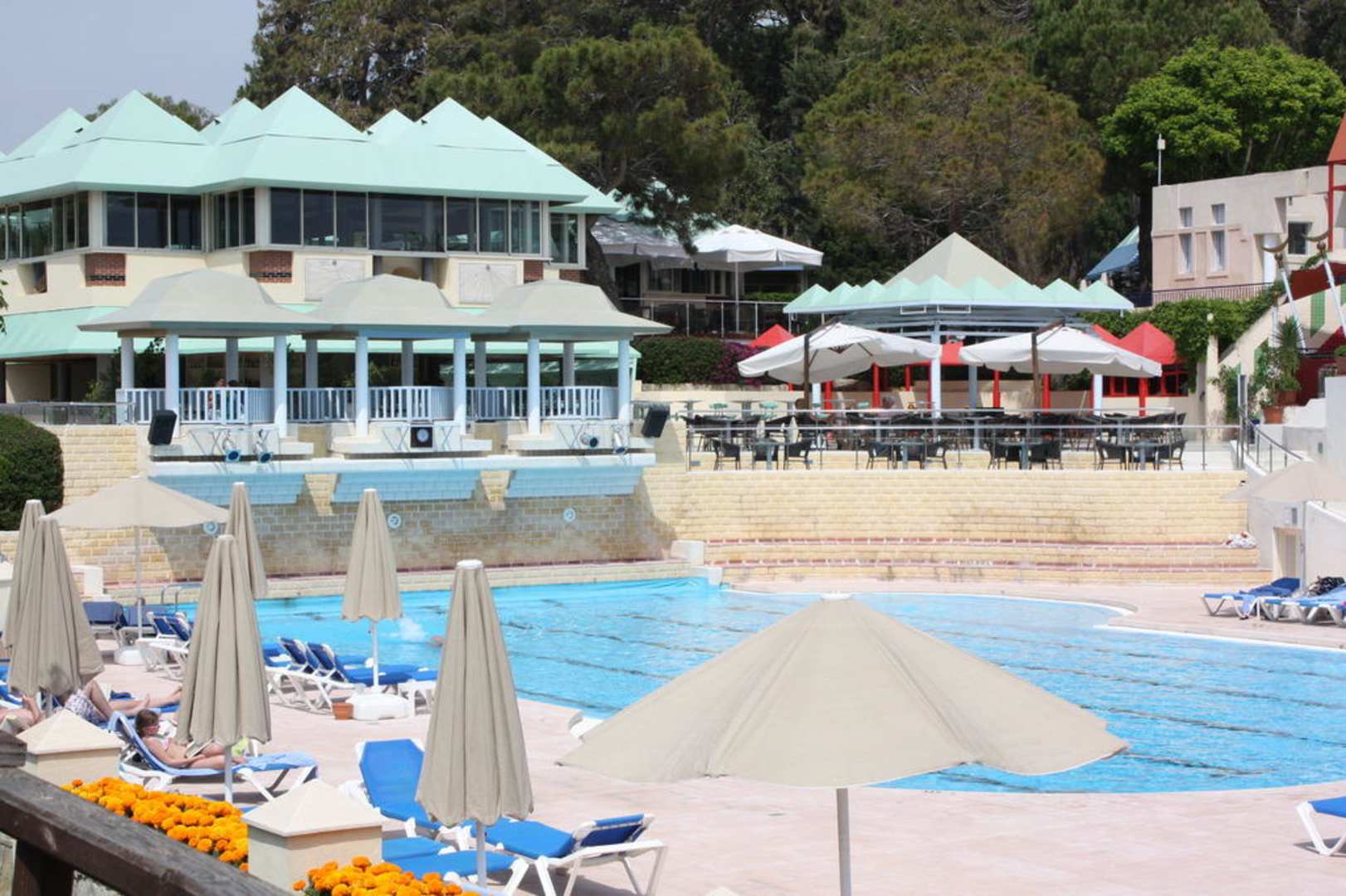 Blick über den Pool zum Hauptpool, Kinderpool und Bar