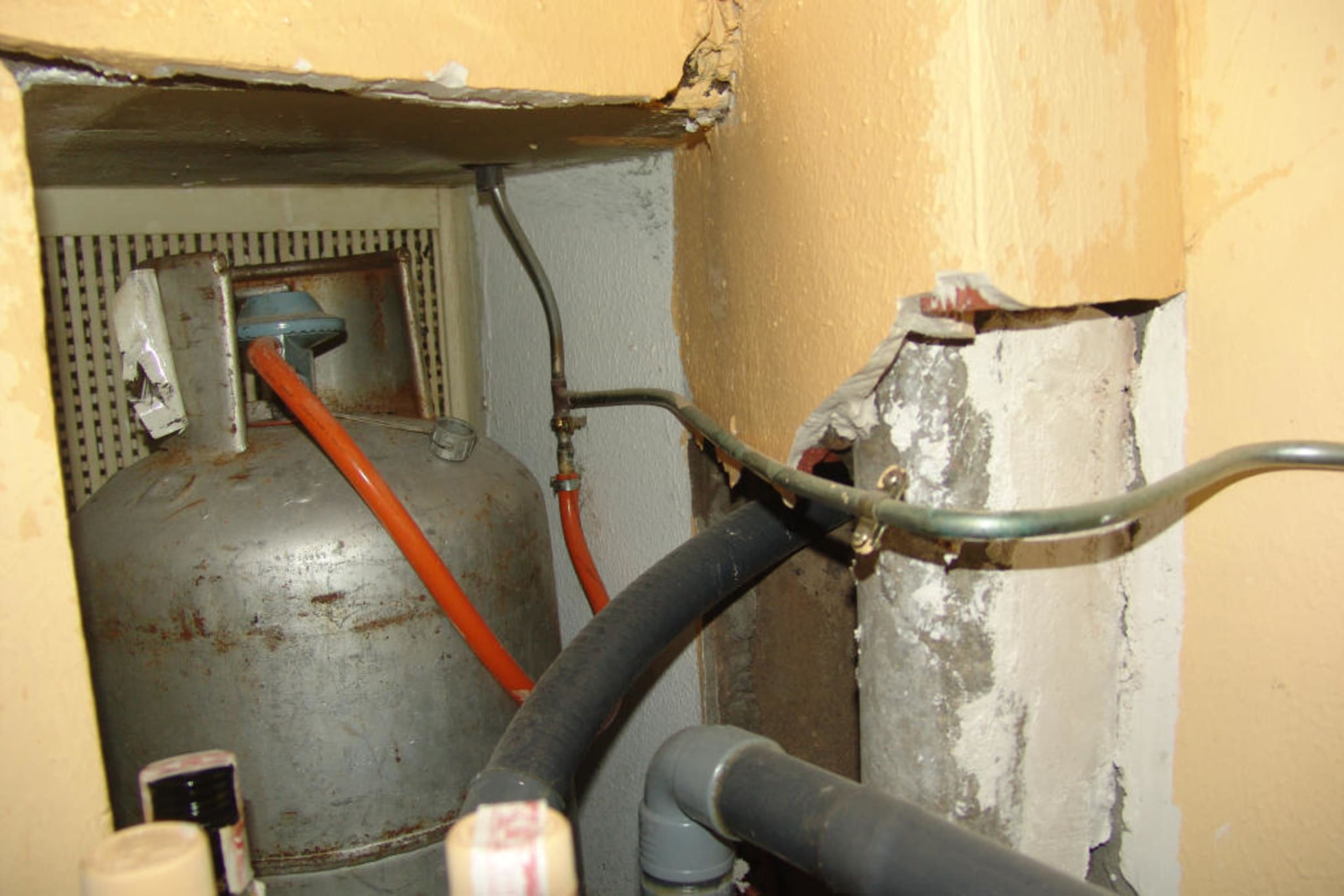 Man musste nichts von Technik verstehen, um hier festzustellen, dass diese Anschlüsse - alle unterhalb des Küchenblocks - kaum einer EU Norm entsprachen. Die Tür war diejenige, die zum Flur führte und teilweise offen stand.