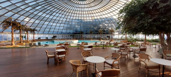 Unbeheizter überdachter Außenbereich mit Pool Erweckt den Eindruck wie bei einer Therme ( z.B. Bad Wörishofen) ist aber UNBEHEIZT und deshalb nur im Sommer ( vl ab Mai) nutzbar. Temperaturen im Februar 15 Grad :-(