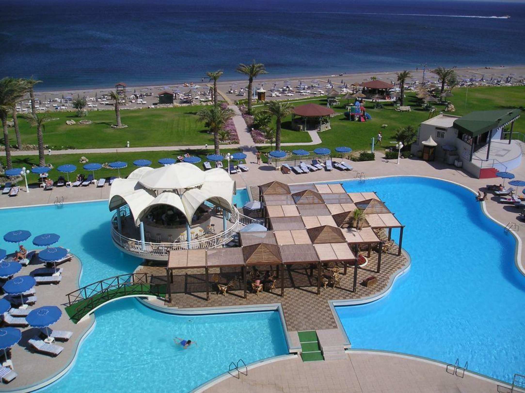 Ausblick vom Zimmer auf die Pool- Landschaft mit Poolbar in der Mitte