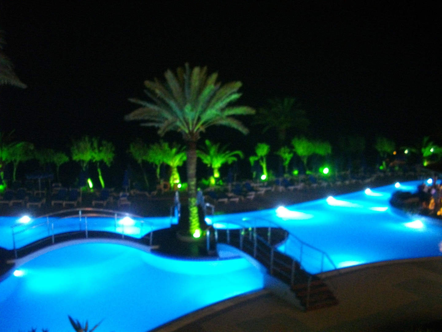 Nächtliche Poolanlage mit Brücke