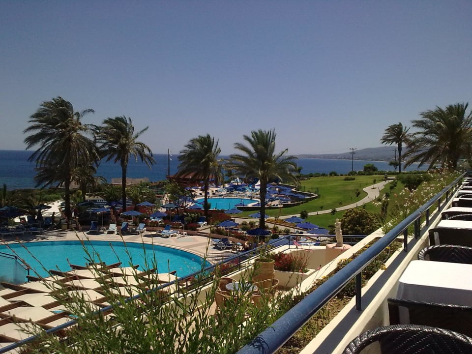 Blick von der Frühstücksterrasse auf die Pools