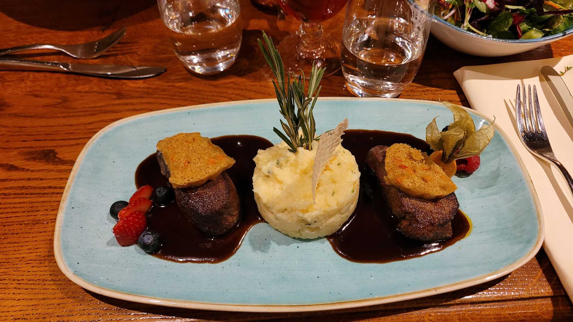 Hirschmedallion mit Kürbiskruste und Kartoffelstampf