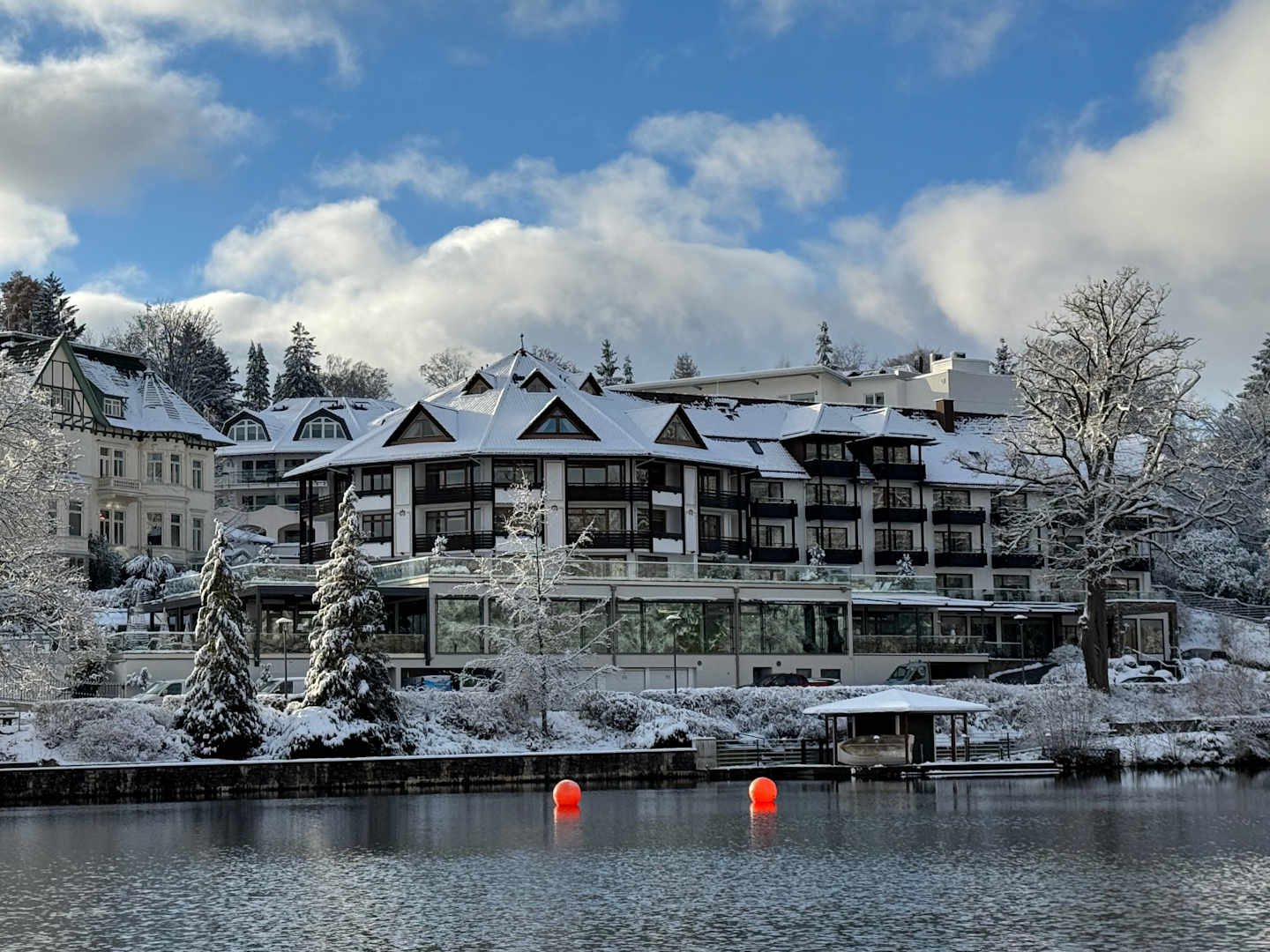 Blick vom Schmelzteich auf den verschneiten Hotelkomplex