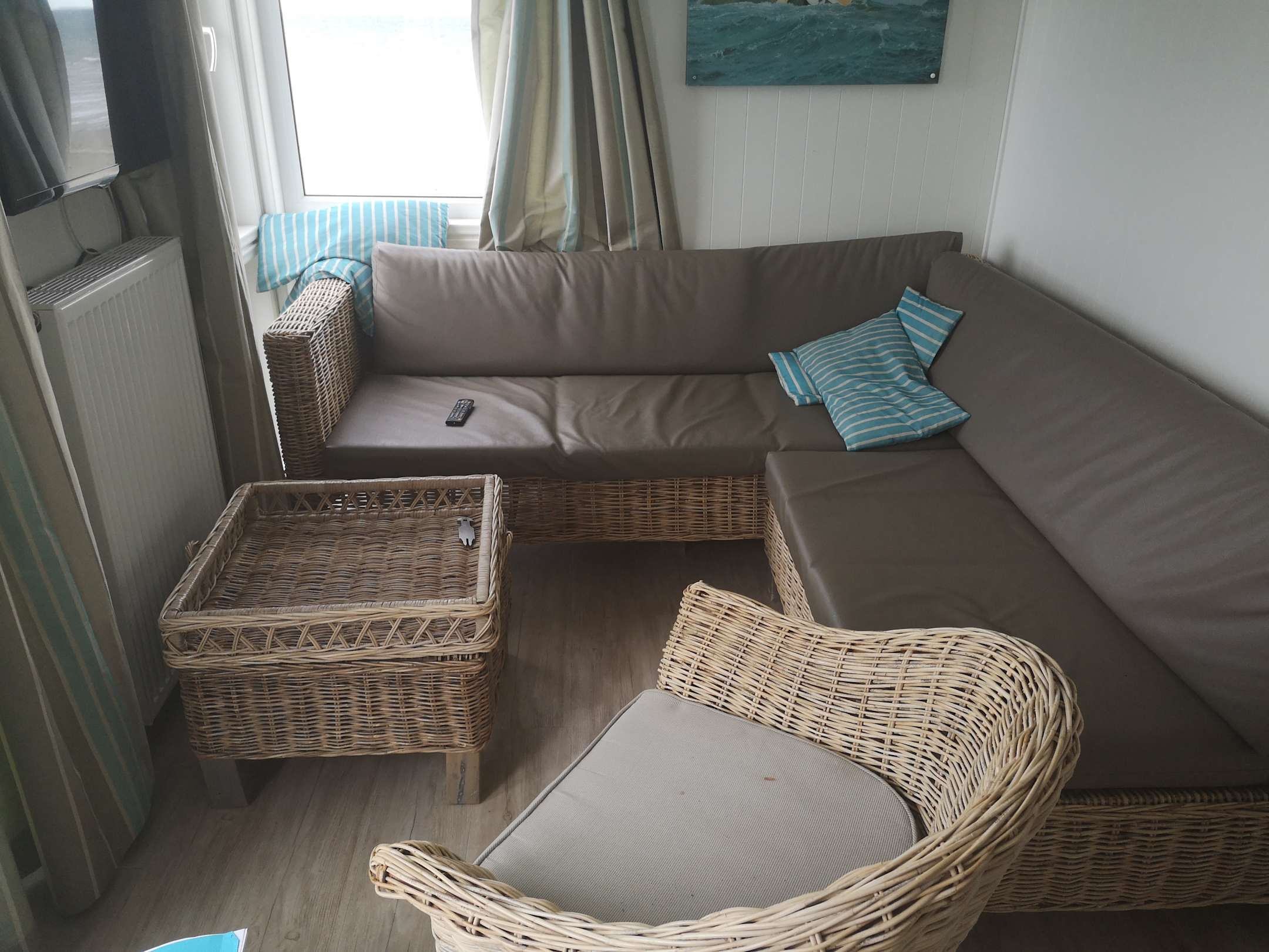 Wohnzimmer, die Auflage auf dem Sofa ist Plastik.