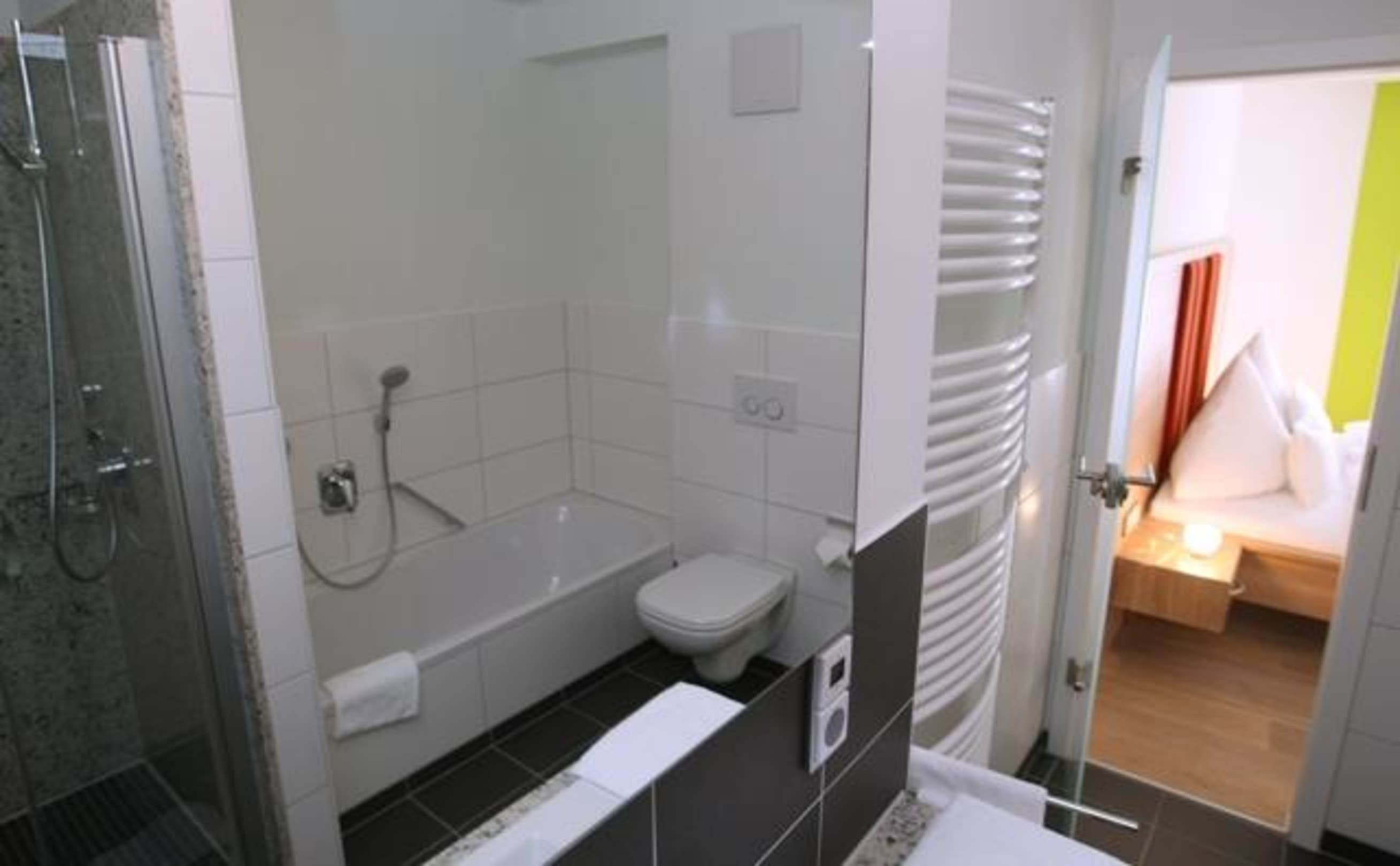 BadezimmerUnsere Badezimmer sind ausgestattet mit Dusche / WC, teilweise Badewanne; Fön, teilweise Radio; Duschgel, Badehocker und Badeslipper.